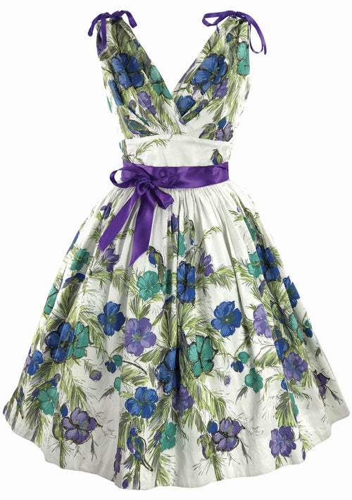 Early 1960s Purple and Green Floral Border Print Sundress New!