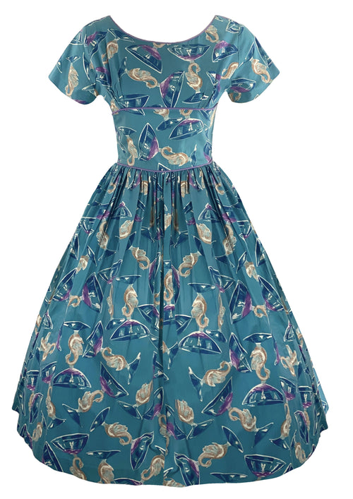1950s Novelty Print Teal Blue Cotton Dress- New!