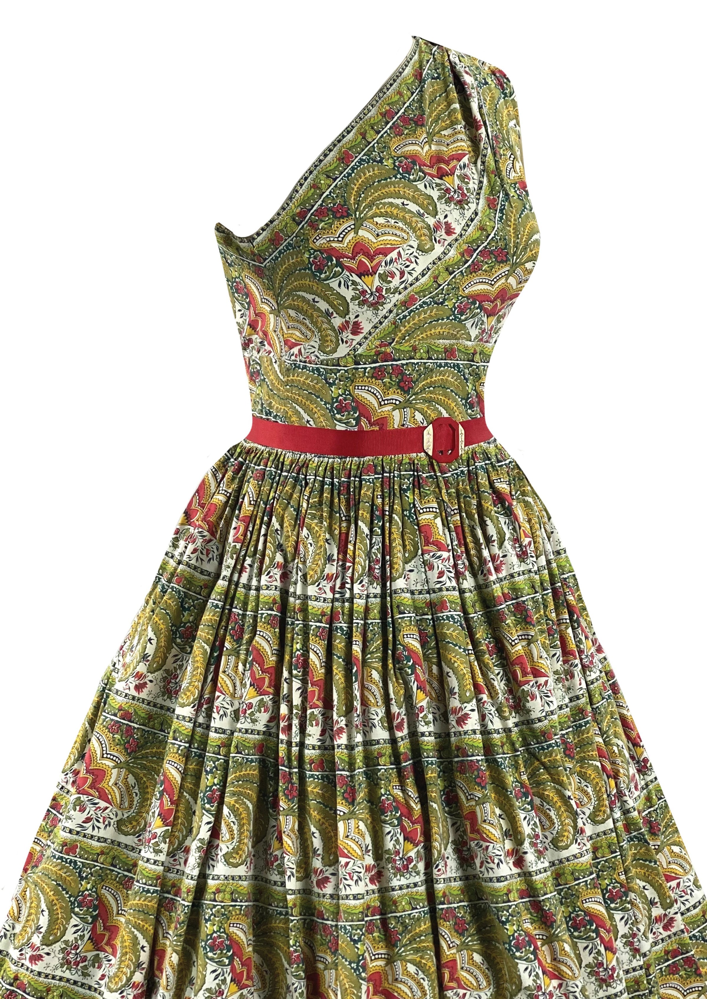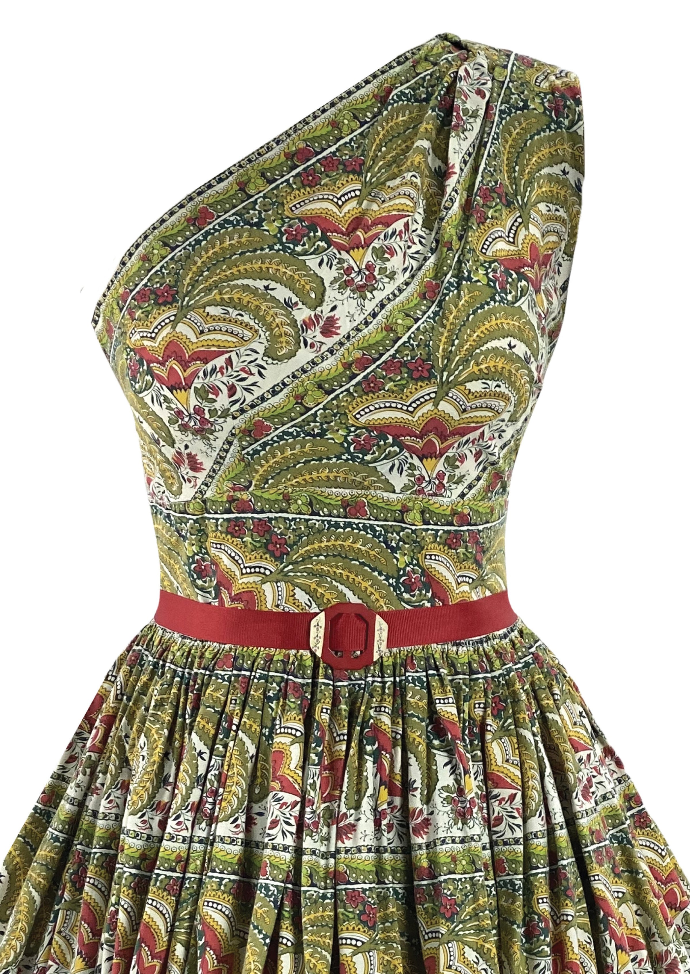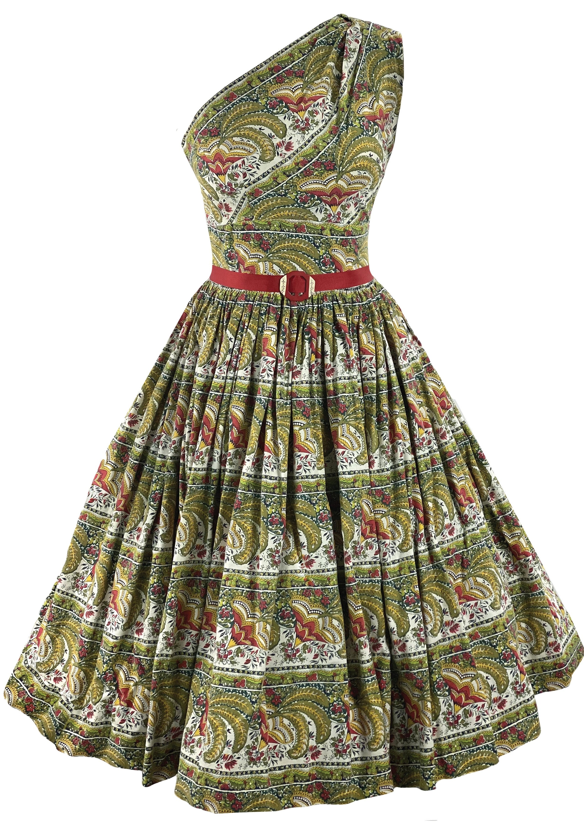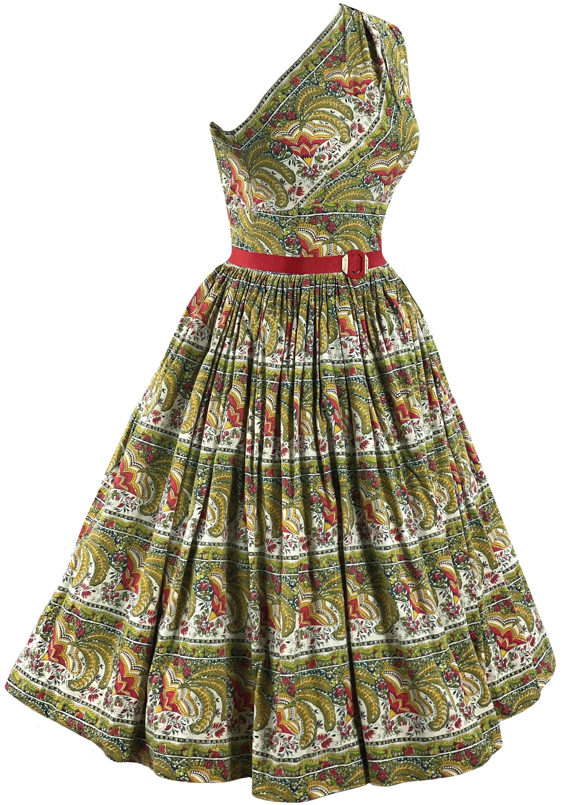 No notable flaws that I can see. The print may not be as bright as it once was but really hard to tell as the inside hem is exactly the same. The neckline has been shortened at the shoulder apex but easily returned to original. The belt is for presentation purposes only and not in this sale.