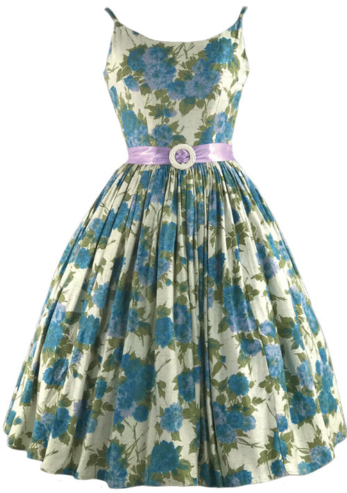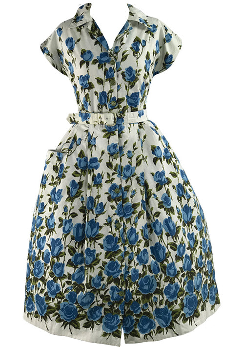 Vintage 1950s Muted Blue Roses Cotton Dress - New!