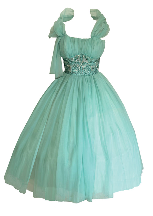 Late 12950s Seafoam Green Cocktail Dress with Sequin Cummerbund - NEW!
